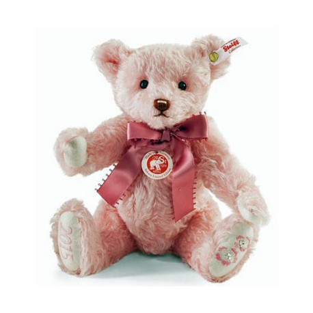 The 5-jointed bear, dressed in the finest curly mohair, is dressed in a festive manner: its left sole shows two embroidered cherry blossoms studded with six SWAROVSKI elements, on its right paw is embroidered the year of its manufacture 2015.