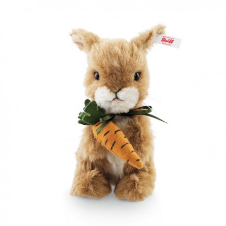 As soon as the first rays of sunshine appear, he sets off in search of fresh grass. He's brought a carrot to nibble on just in case. You never know if there'll be enough fresh fodder! On a satin band around his neck, Mommel Rabbit wears a felt carrot with its greenery. Made from reddish-brown alpaca, he hides wonderfully in fields and forests.