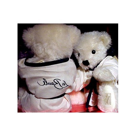 This little marvel is only sold in our shop in La Baule. It measures 32 cm, it is made of long-haired, white mohair, it wears a honeycomb fabric bathrobe, embroidered "LA BAULE".