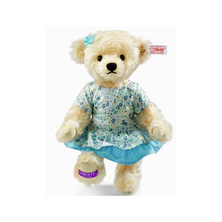 Isabel Teddy Bear de Steiff est le dernier en date à présenter une estampe spécialement commandée par Liberty of London, d’après ses sœurs, Emeley et Violet. Elle est fabriquée à partir de mohair légèrement bouclé de couleur vanille pâle, avec de grands yeux pétillants et un nez audacieux cousu à la main.